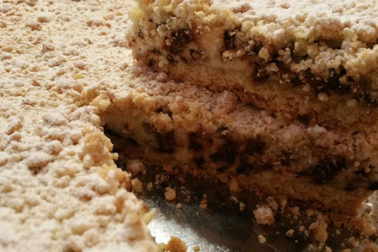 In una ciotola mettete la ricotta, zucchero e gocce di cioccolato. Amalgamate tutto. In una teglia con carta forno mettete metà impasto sbriciolato livellando bene. Poi mettete la ricotta e stendete.